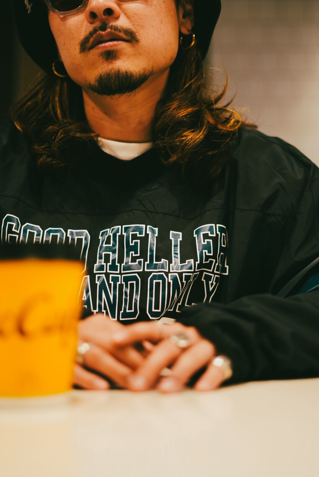 フロントには74のナンバリングとブランド名を組み合わせたオリジナルカレッジロゴを配したナイロンフットボールTシャツ。袖にはも同じく2本ラインと74のナンバロングを、左腕にはアクセントでアメリカンテイストなワッペンをオン。ボディは肉厚なナイロンと裏地にはメッシュを。首元は浅めなVネックタイプ。サイドにはスラッシュポケットが付き、使い勝手良し。袖口、裾にはバンド入りのパイピングが付きストレスない仕様に。シルエットもゆったりしております。冬はインナーとしても活躍出来、春先は一枚で着れるアイテムでは。