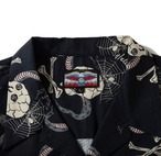 ビンテージのスカジャンの中でもプレミアム度の高いスパイダーウェブの髑髏蛇をモチーフに総柄で作製した50'sライクなスカシャツをリリース。素材もレーヨン65%コットン35%のレーヨンならではの着心地とドレープ感のある、コットンレーヨンのブロード地を採用。パターンは身幅、肩幅とややルーズに袖丈を若干長く、着丈は長すぎない、アメリカンナイズナなボックスシルエットでの開襟シャツタイプに。